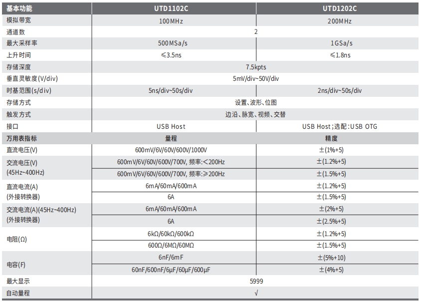 最大采样率:UTD1102C - 500 MSa/s 、 UTD1202C ? 1G Sa/s