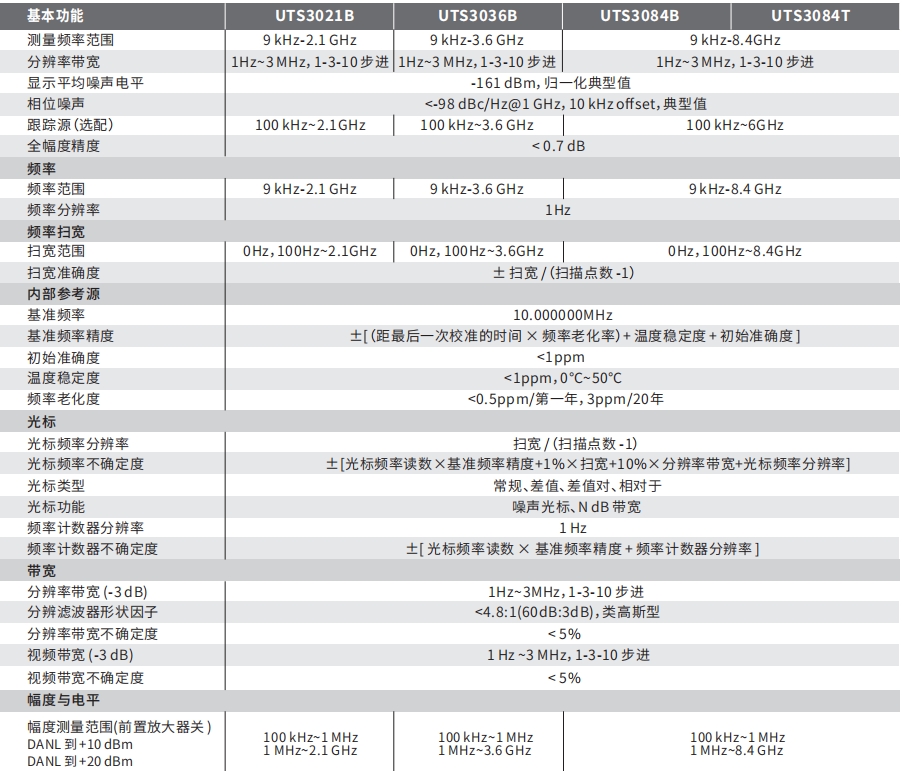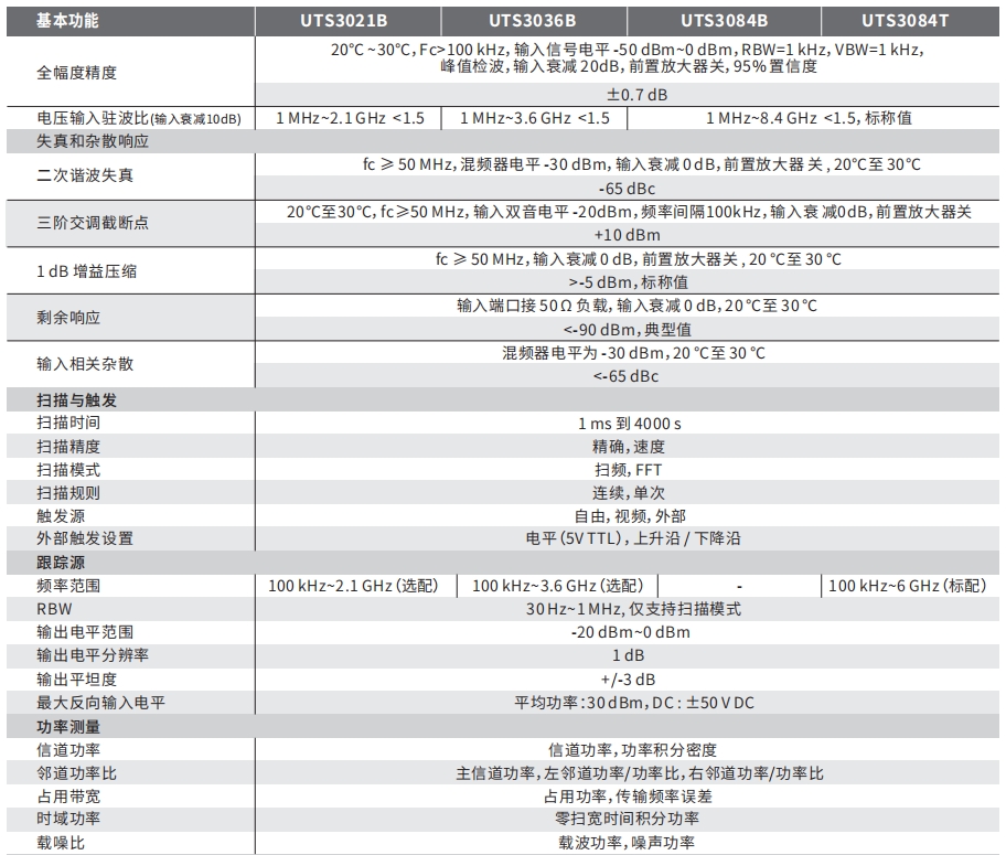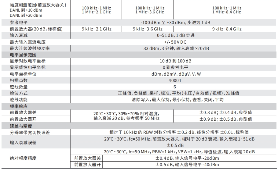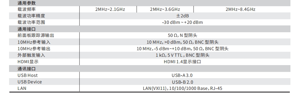 频谱分析频率范围: 9kHz~2.1GHz/3.6GHz/8.4GHz